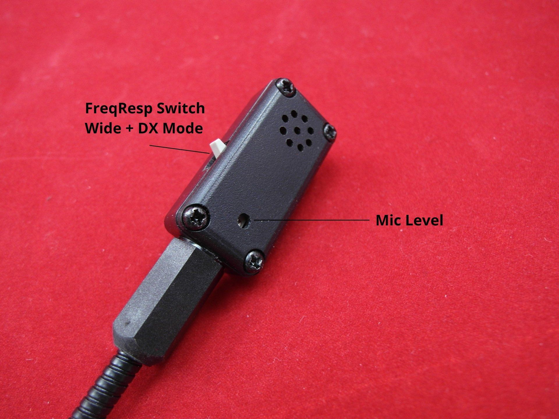 ( S/N 72 dB , Noise-Cancel Typ / Nebengeräusche typ. att. > 25 dB in 50cm ) - Eigener Mic-Amp mit Möglichkeit zur Level-Einstellung und AFu-Umschalter für Freq.-Response, Phantomspannung